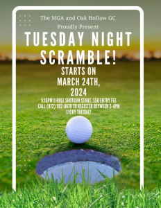 Join us every Tuesday evening beginning March 24, 2026 for our Tuesday Night Scrambles! Grab your clubs and come enjoy a fun, competitive round with fellow golfers.
